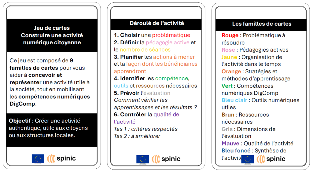 Ce jeu de cartes permet de construire une activité pédagogique numérique et citoyenne. Il est composé de plusieurs familles de cartes pour vous aider à concevoir et représenter une activité utile à la société, tout en mobilisant les compétences numériques DigComp.